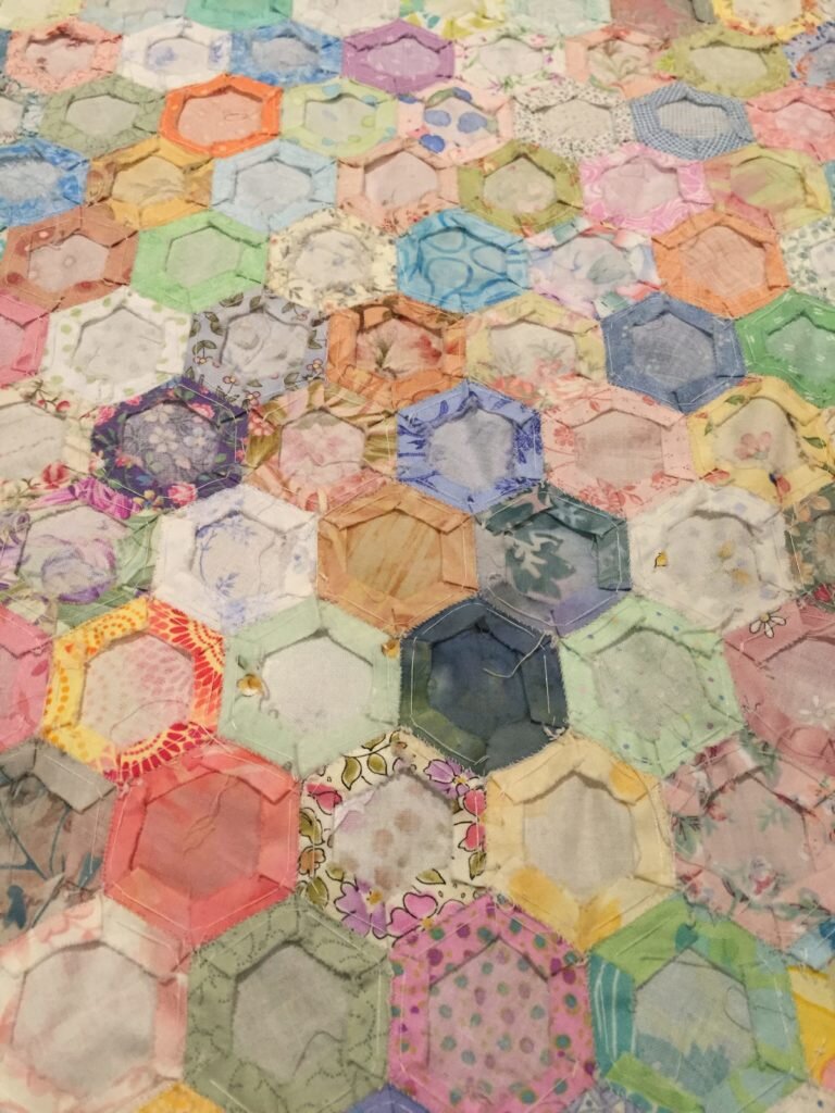 To get an idea of the size, here are the hexes in my hand. I believe she started with 2" hexes and they finish at 1 1/2". It's a spectacular quilt with an endless amount of 'woman hours'. If you're working on an EPP (English paper piecing) project, keep up the good work! It will be a quilt one day. :)