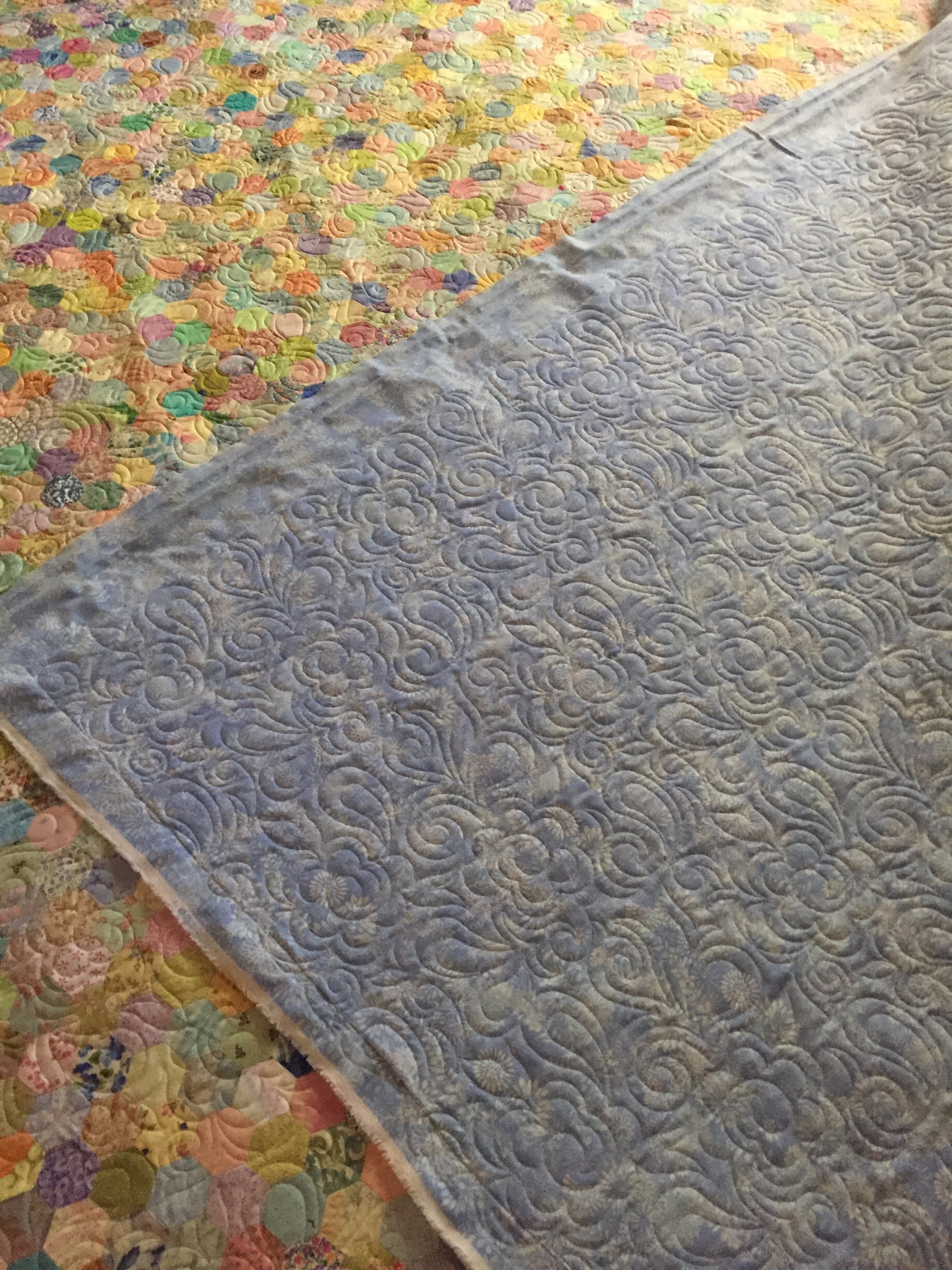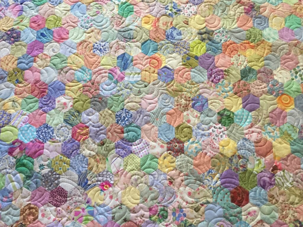 What a beautiful finish to an already amazing top!! A hand pieced, hexagon top, made up of 3,200 pieces. A definite heirloom quilt, created by my good friend, Marla. She hand stitched this quilt over 2 or 3 years. I added an edge to edge digitized design, Fanfare, by Anne Bright.